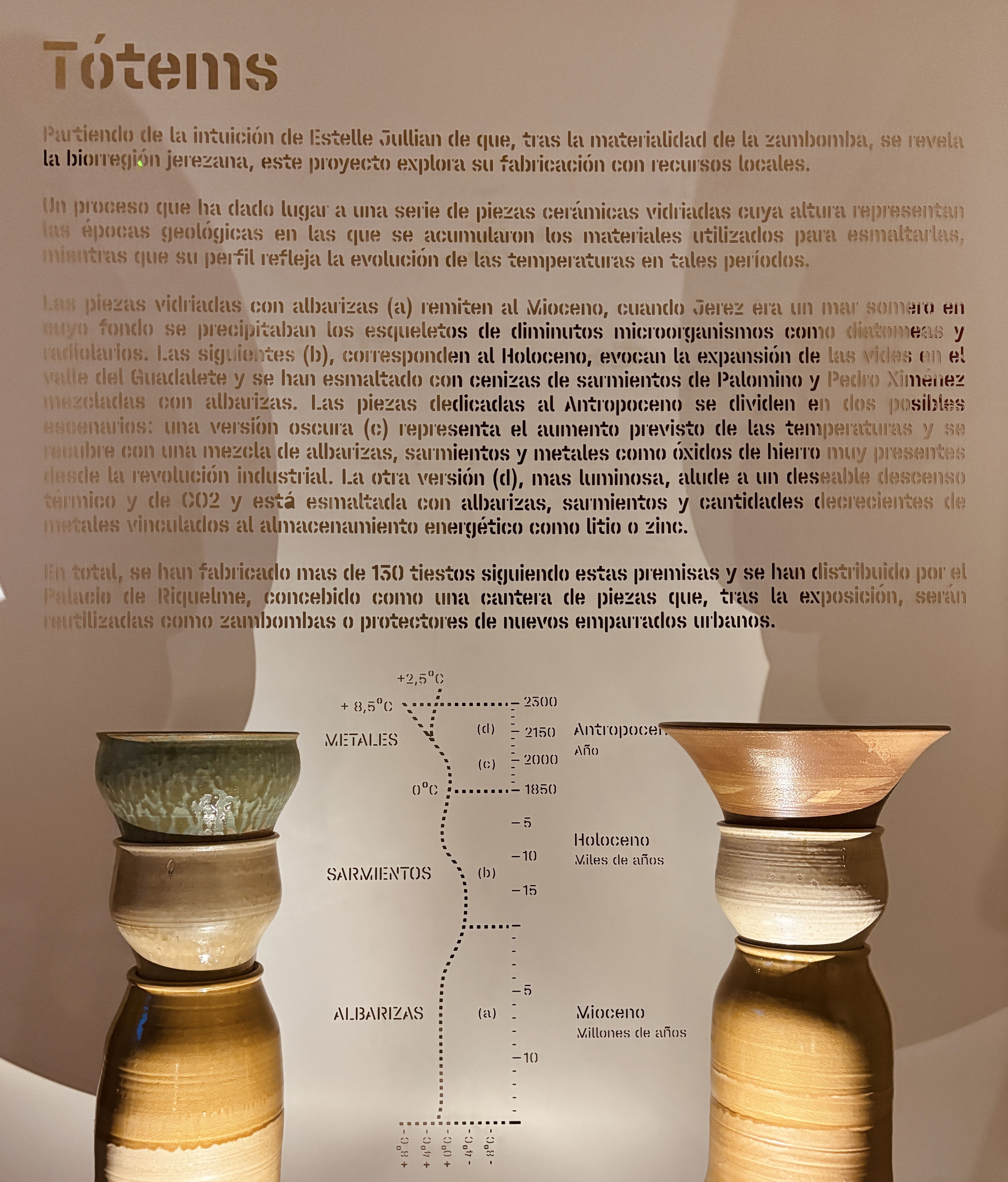 El objetivo era obtener una serie de piezas que invocaran el paisaje de Jerez desde su nacimiento hace 10 millones de años. Partiendo del diagrama del IPCC que representa el incremento de las temperaturas a lo largo de la historia, diseñamos una adaptación para darle forma con cerámica a través de unas terrajas.