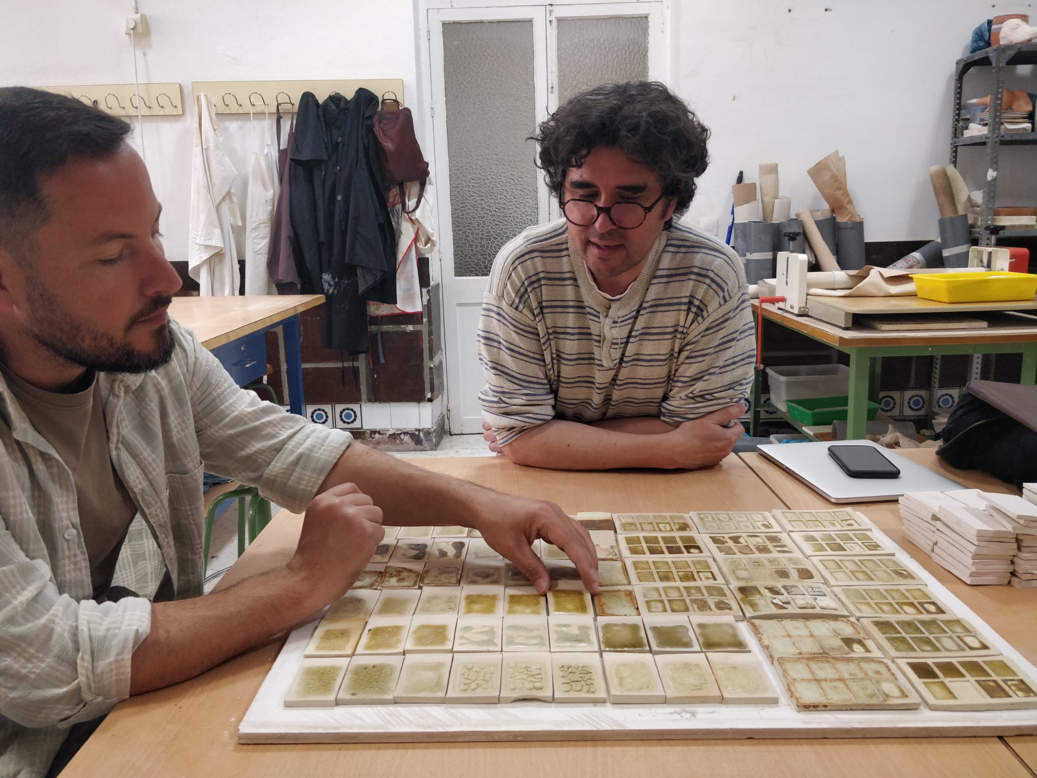 La colaboración con el curso en Decoración Cerámica de la EASDJ abrió la pista necesaria para continuar con la creación de las zambombas climáticas. Tras las visitas al campo y la celebración de la primera zambomba, los estudiantes crearon más de 50 pruebas de esmaltes bajo la supervisión de los profesores Luis Torres y Enrique Carrillo. Una muestra extensa de acabados y tonalidades creadas con diferentes formulaciones de albarizas, cenizas de sarmientos y óxidos de metales en proporciones diversas.